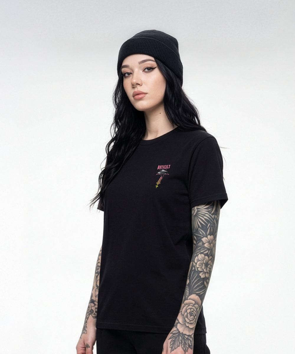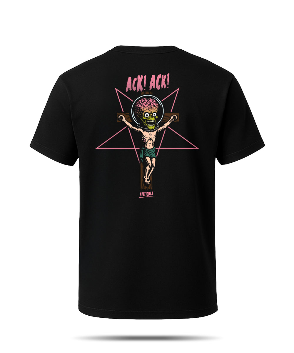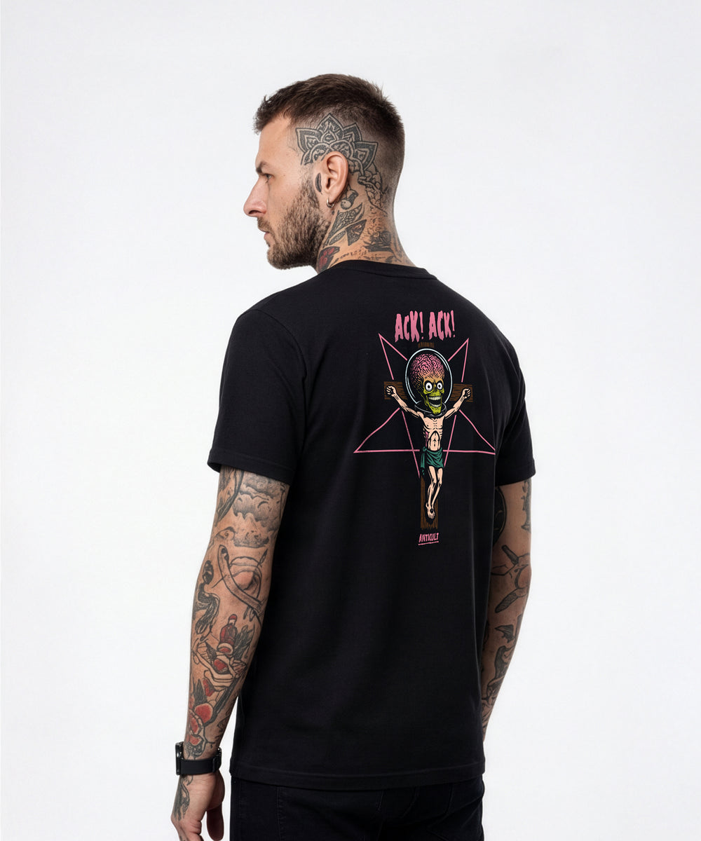Vorne bleibt es zurückhaltend. Hinten wird’s deutlich. Der Alien-Backprint mit „ACK! ACK!“-Schriftzug ist ein Statement ohne Übersetzung. Passt zu Metal, Punk, Hardcore, Skaten und Tattoos. Oder zu gar nichts davon. Auch okay.