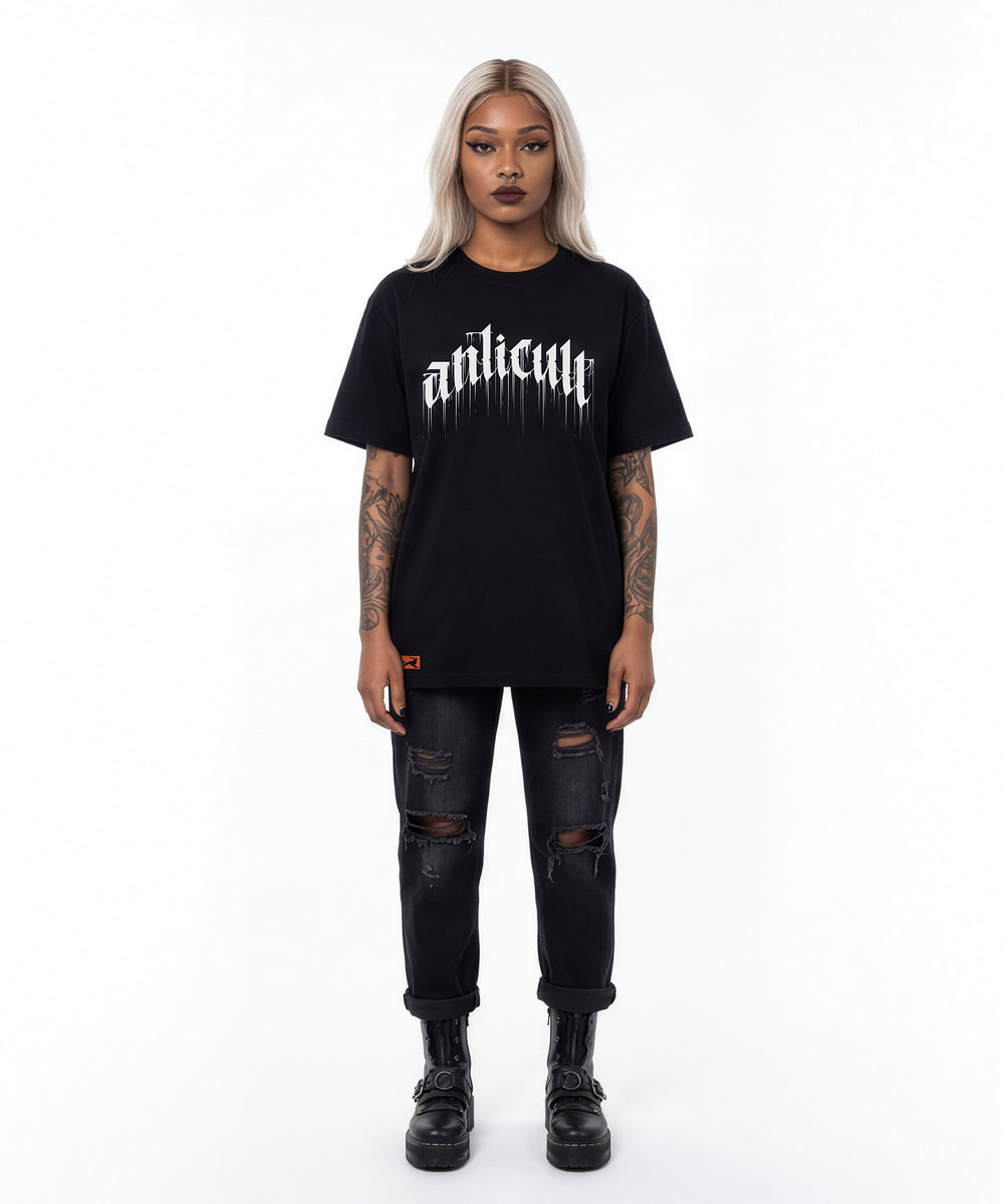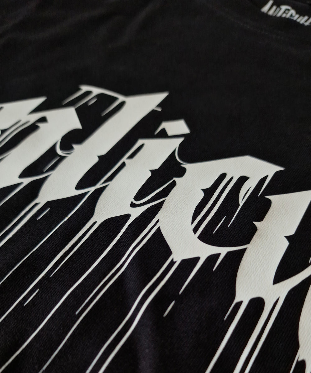 Der Gothic-Drip-Frontprint ist das Statement. Keine Rückseite, kein Lärm. Passt zu Metal, Punk, Hardcore, Skaten und Tattoos. Oder zu gar nichts davon. Auch okay.